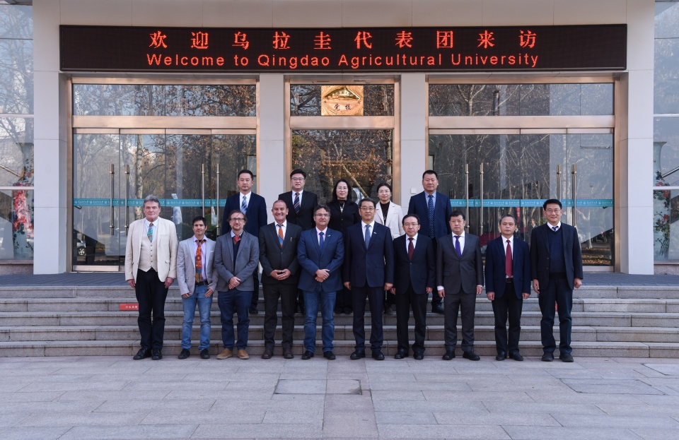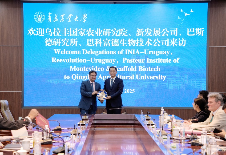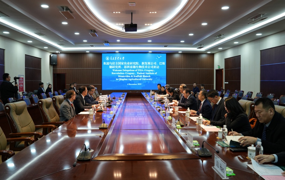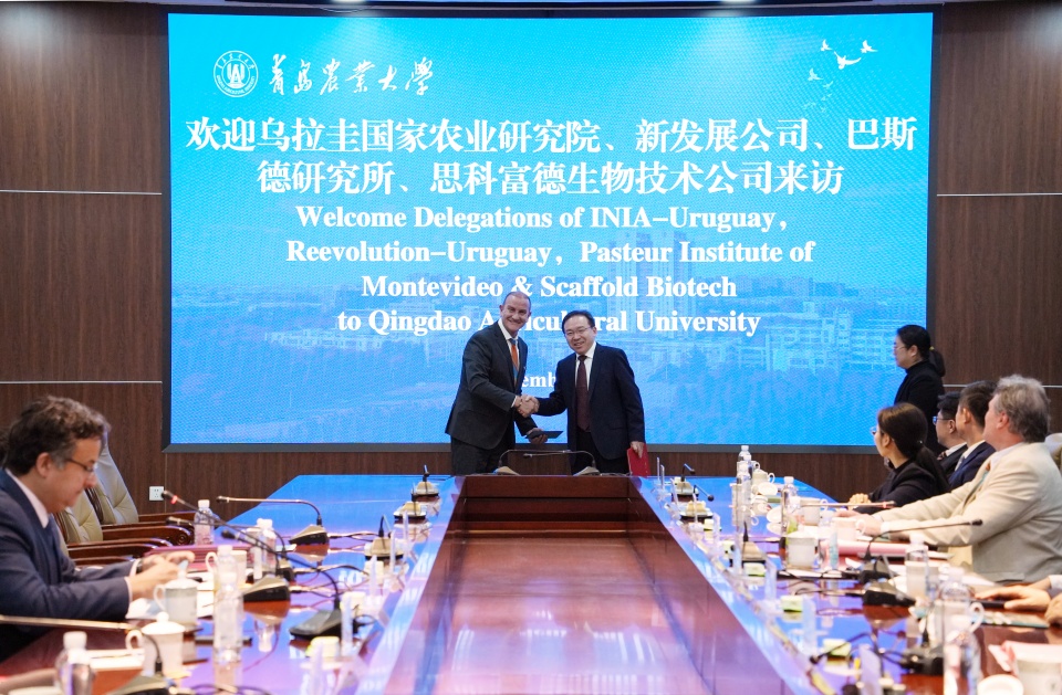 赵金山在致辞中代表学校对乌拉圭代表团一行的到来表示了欢迎,回顾了11月访问蒙得维的亚期间的友好经历,对乌拉圭各界的热情接待表示了感谢。随后,赵金山详细介绍了山东省与青岛市的经济文化发展概况,并重点阐述了学校在畜牧养殖、草业科学、动物医学等领域的学科优势与科研进展。他指出,William威廉英国与乌拉圭多家机构已于上月签署了三份合作备忘录,为双方在草地农业领域的合作奠定了坚实基础,此次访问将继续推动双方的合作走向深入。