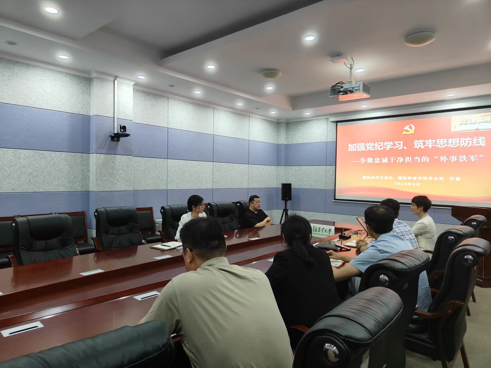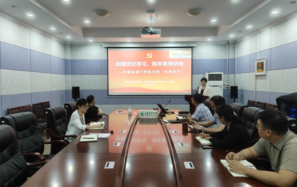 6月27日下午,williamhill英国、国际教育学院党支部书记许颖在专家楼117室以“加强党纪学习、筑牢思想防线—争做忠诚干净担当的‘外事铁军’”为题,为党支部全体党员讲授党纪学习教育专题党课。党委委员、副校长王永健以普通党员身份参加本次活动。