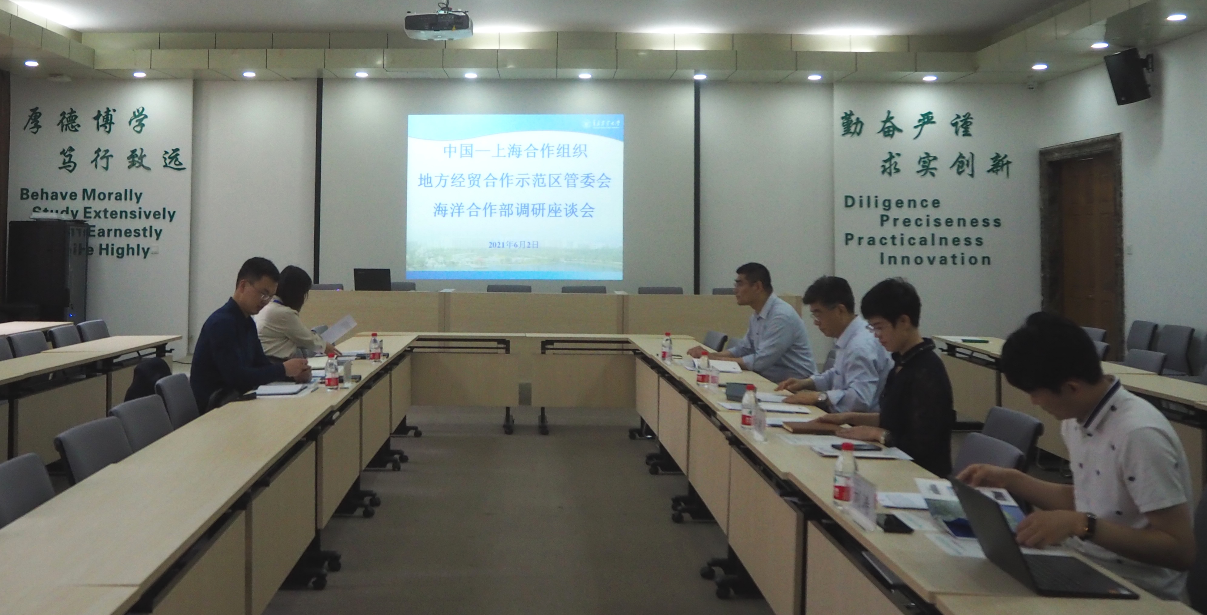 田义轲代表学校向郑师一行来校调研表示欢迎,并从学校发展概况、人才培养、科技创新、社会服务、国际交流与合作等方面介绍了学校的基本情况和取得的成绩。郑师介绍了上合示范区管委会海洋合作部的主要业务板块和未来发展方向。双方共同观看了上合示范区宣传片,就上合示范区制度创新农业方向和创新案例进行了讨论,并在涉农领域和对外交流方面开展合作达成了初步共识。