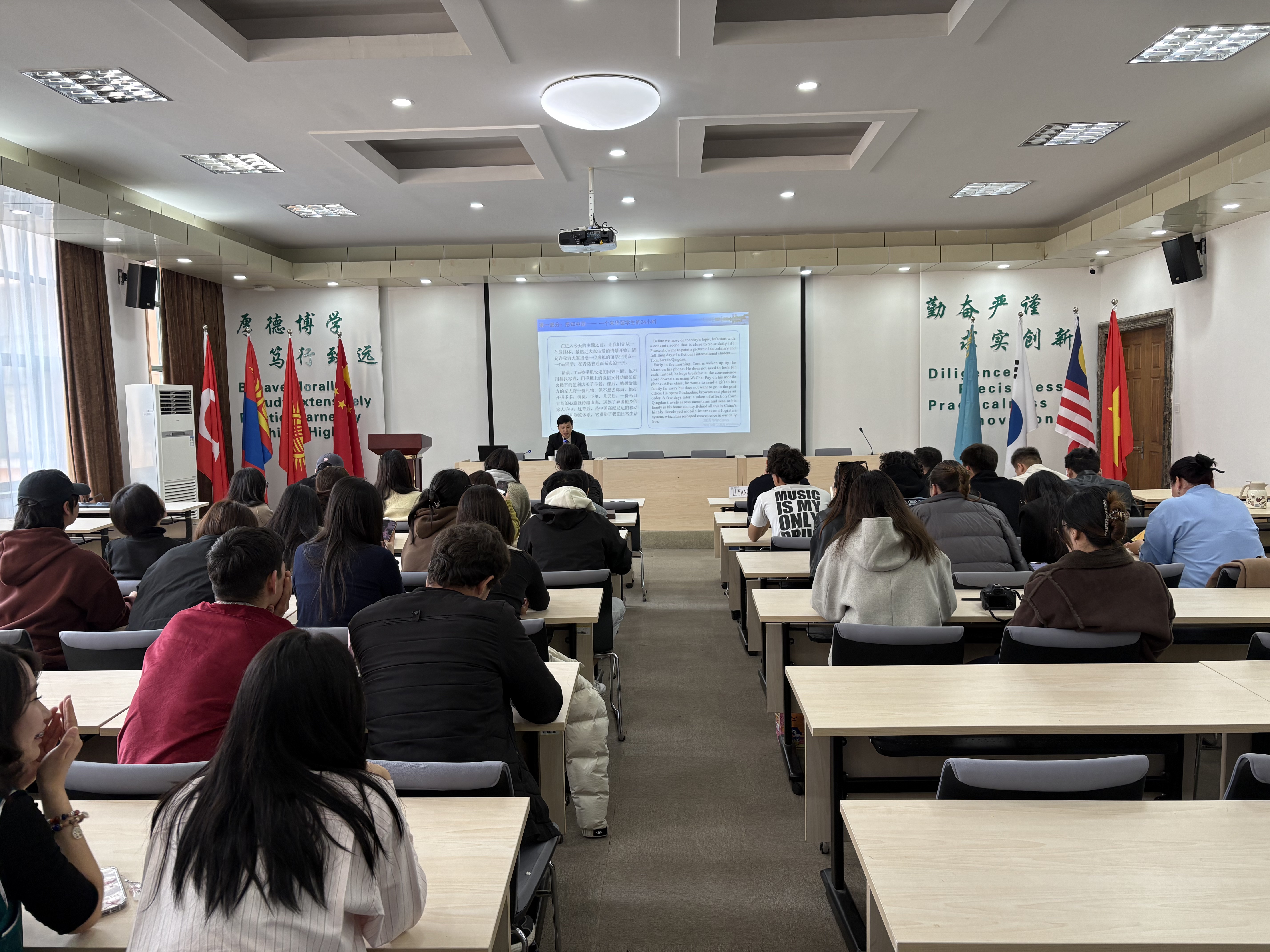 张兴华以虚拟留学生Tom在青岛一天的生活为线索,串联起移动支付、智慧物流、共享交通、高铁网络、多元餐饮与文娱生活等场景,生动而具体地展现了中国社会在数字化、基础设施与城市生活方面的现代化便利性与发展活力。接着,他从共建“一带一路”框架出发,阐释这一倡议如何像一座促进“民心相通”的桥梁,不仅推动经贸往来,更带动了如TikTok、SHEIN、中国影视剧、火锅文化等生活方式与文娱内容在沿线国家年轻人中的流行,指出文化交流是相互影响、相互交融的过程。随后,他引导学生正视跨文化环境中可能遇到的误解与冲突,指出打破刻板印象、通过真诚交往理解具体个体与文化差异的重要性,并介绍了学院将通过文化体验、社群融合、实践分享等方式搭建理解互鉴的平台。最后,他鼓励全体留学生珍惜留学时光,在刻苦钻研学业的同时,主动承担起“文明传播互鉴的青年使者”的责任,利用自身独特优势,成为双向传递文化、增进友好理解的桥梁。整场报告将宏阔视野与鲜活案例相结合,讲解深入浅出,在现场学生中引起了广泛共鸣,收获了阵阵掌声。