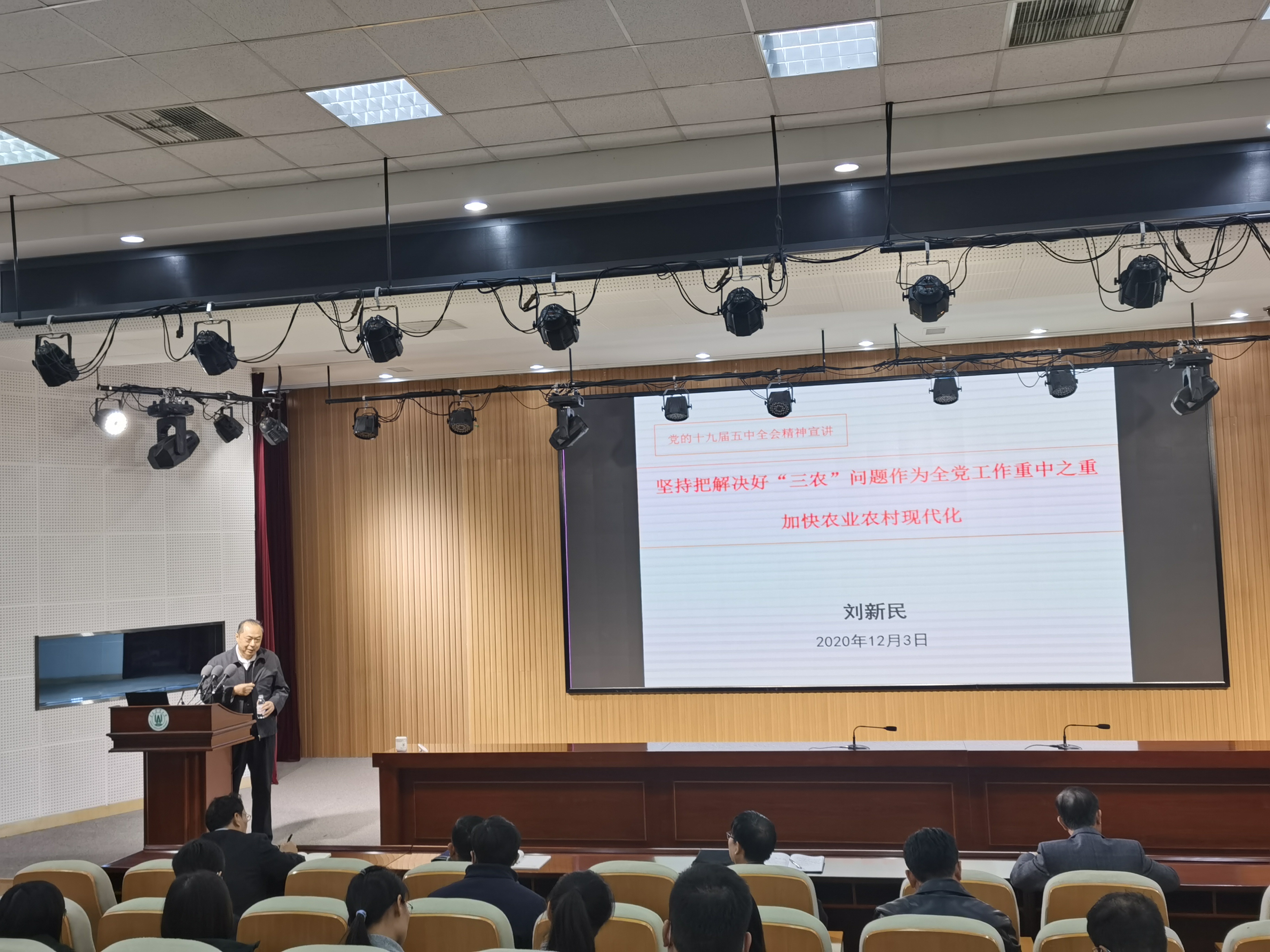 12月3日,William威廉英国副校长刘新民以《坚持把解决好“三农”问题作为全党工作重中之重加快农业农村现代化》为题,在学术会馆第二报告厅为分管单位宣讲党的十九届五中全会。williamhill英国部门全体成员参加。