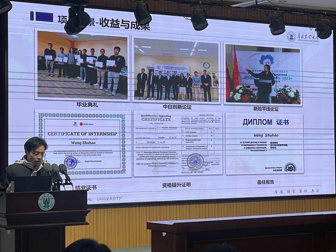 活动中,来自机电工程学院的王书豪、刘知鑫、马世宽三名同学分别从整体概况、科研活动和日常生活三个方面向大家介绍了赴白俄罗斯国立技术大学访学期间的学习和生活。来自食品科学与工程学院的王佳阳同学与来自植物医学学院的翟朝池同学结合自身经验分享了项目申请的注意事项。