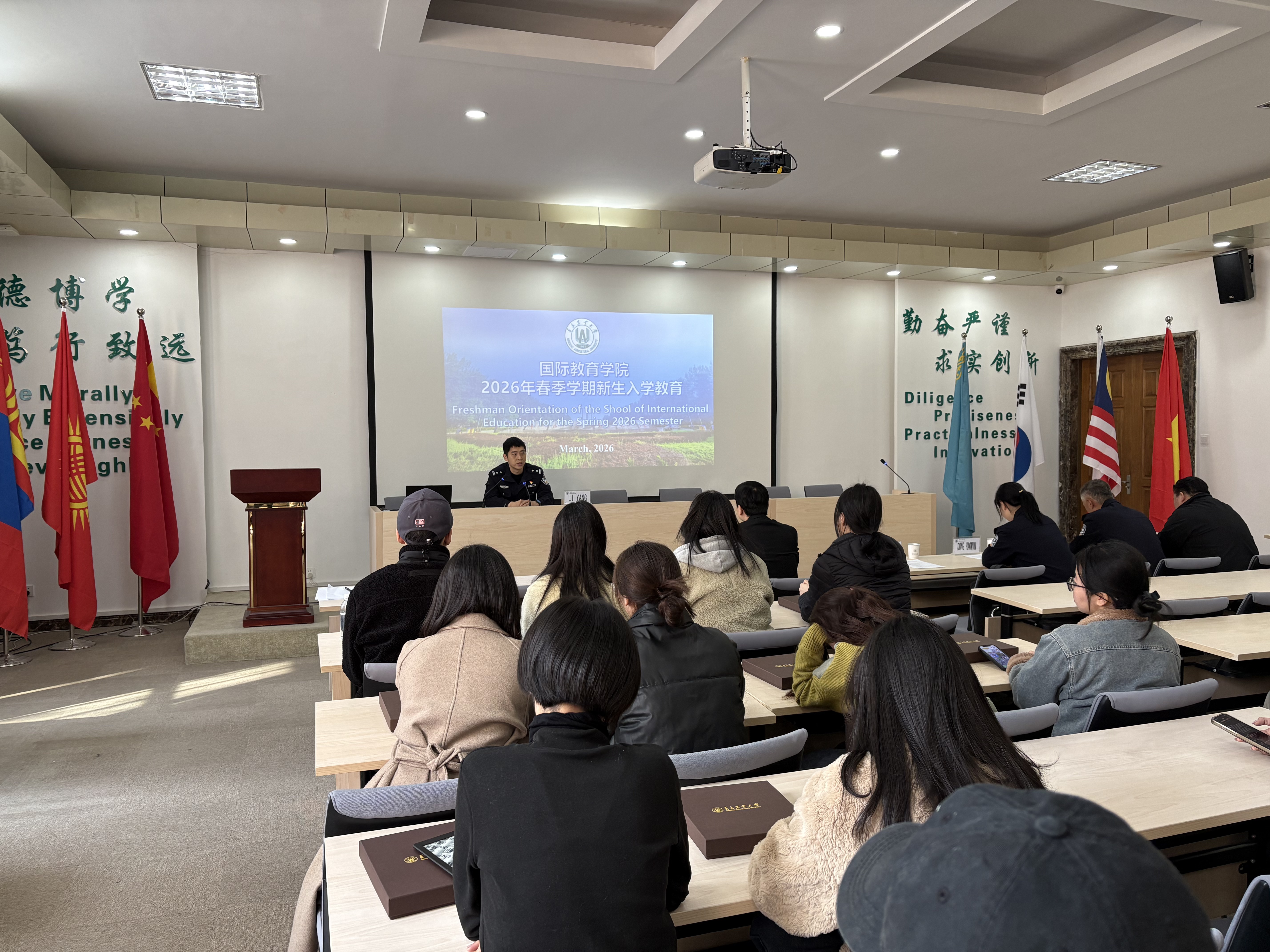 李扬为全体学生作专题辅导。他详细讲解了国际学生在华期间必须遵守的中国法律法规、社会公共秩序,以及国际学生人身财产安全及防诈骗等注意事项,为同学们提供了及时的政策指引。李扬强调,国际学生应自觉遵守中国法律,增强安全防范意识,保障在华留学生活顺利开展。