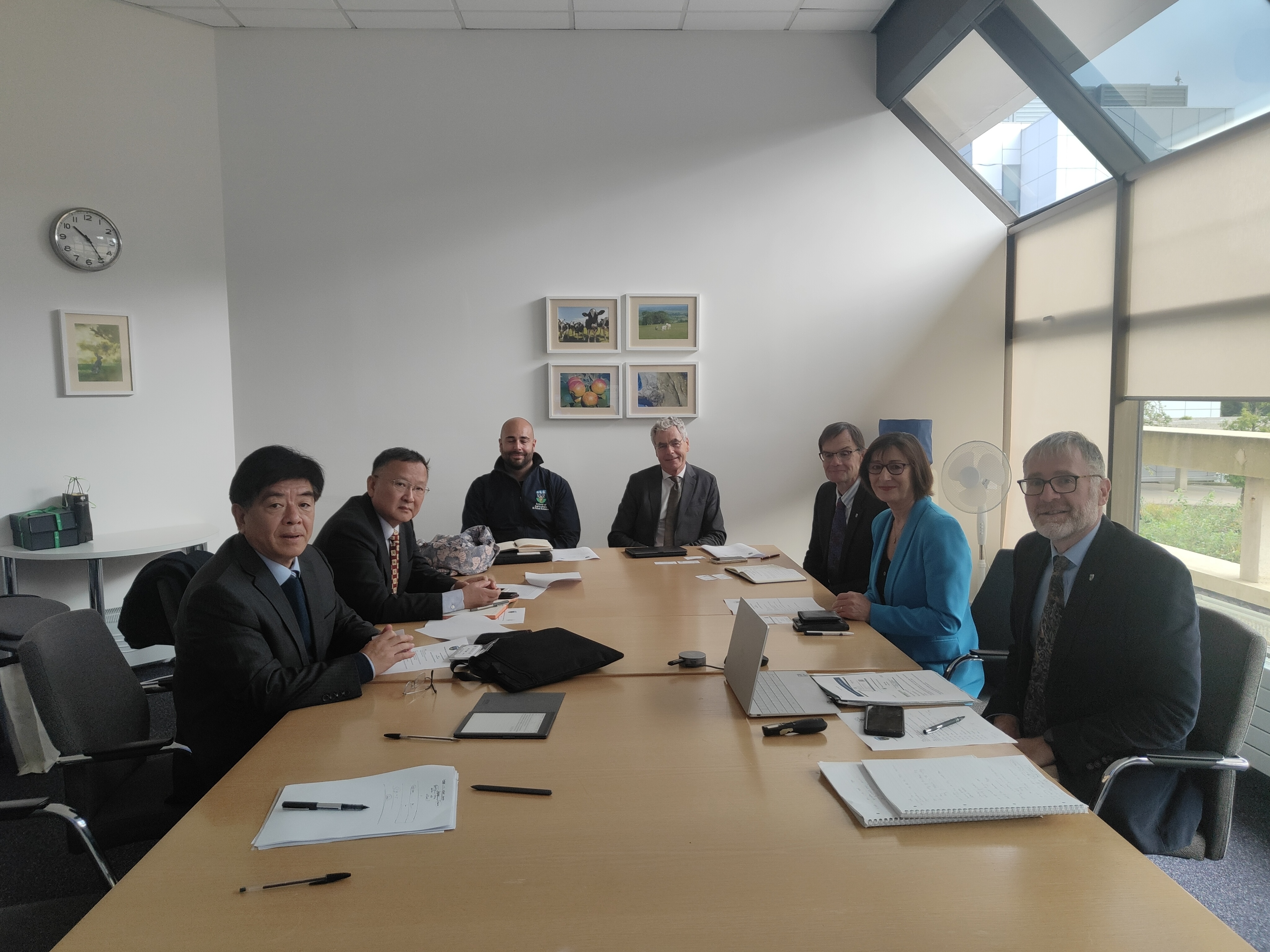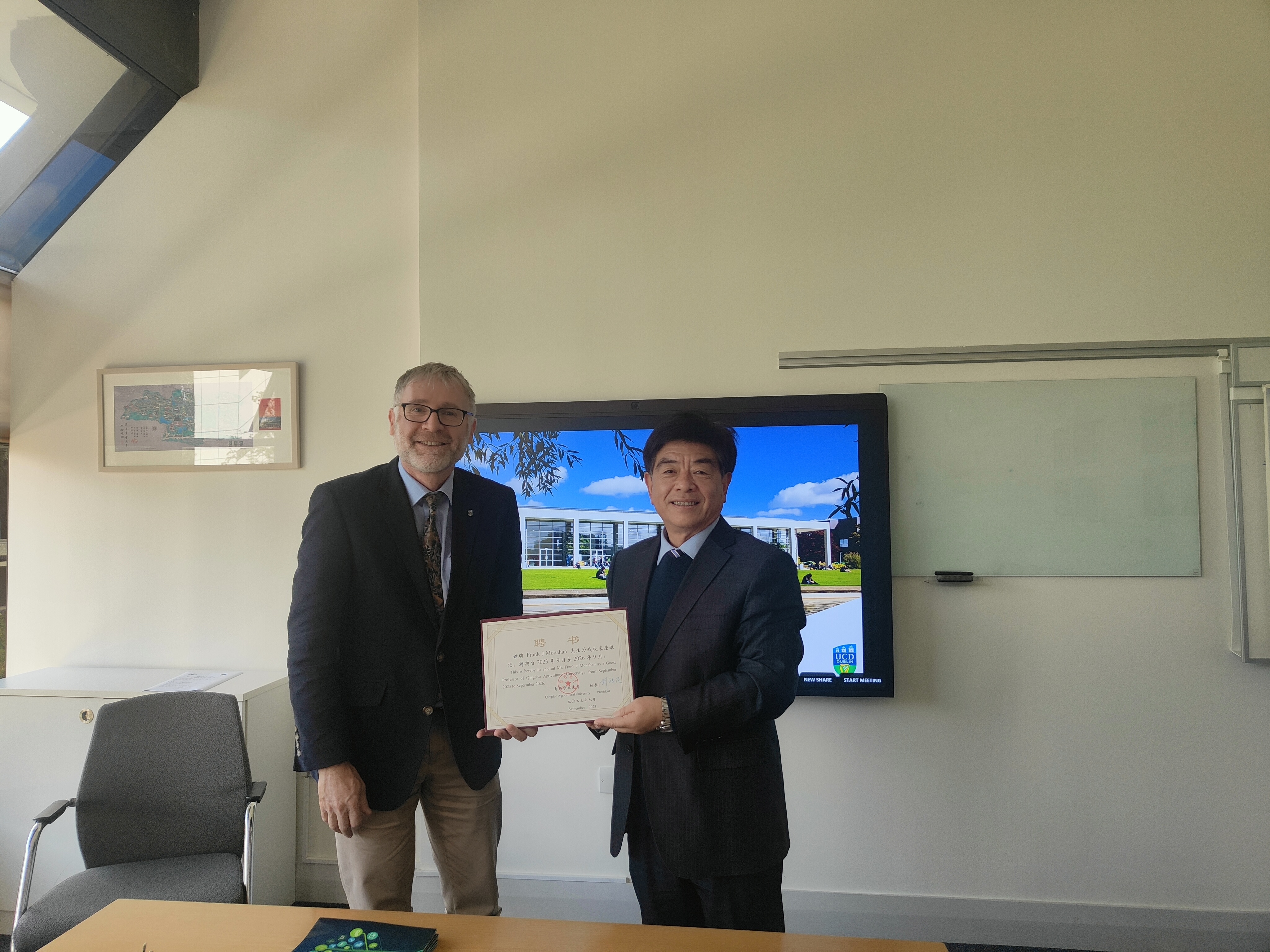 访问爱尔兰都柏林大学期间,都柏林大学副校长多洛丽丝·奥里尔丹教授、农业与食品学院院长弗兰克·莫纳汉教授和校董会董事、农业与食品学院原院长亚历山大·埃文斯等接待了William威廉英国代表团。双方同意建立以学术交流会为依托的常态化沟通机制,联手组织食品营养与健康、食品安全等领域的学术研讨会,开展科研合作;确定了硕士项目的具体合作模式及开展细节,签署了硕士项目协议,为我校巴瑟斯未来农业科技学院学生直升都柏林大学硕士项目打通了渠道。此外,在前期沟通的基础上,学校聘请了弗兰克·莫纳汉和亚历山大·埃文斯为客座教授,田义轲为其发放了聘任证书,为两校进一步开展深入合作奠定了基础。代表团实地调研了罗斯蒙特环境研究中心、食品与健康研究中心,参观了孔子学院、学校图书馆、学生住宿区等。这是我校历史上首次出访爱尔兰高校,开创了我校与爱尔兰高校实质性合作的先河。