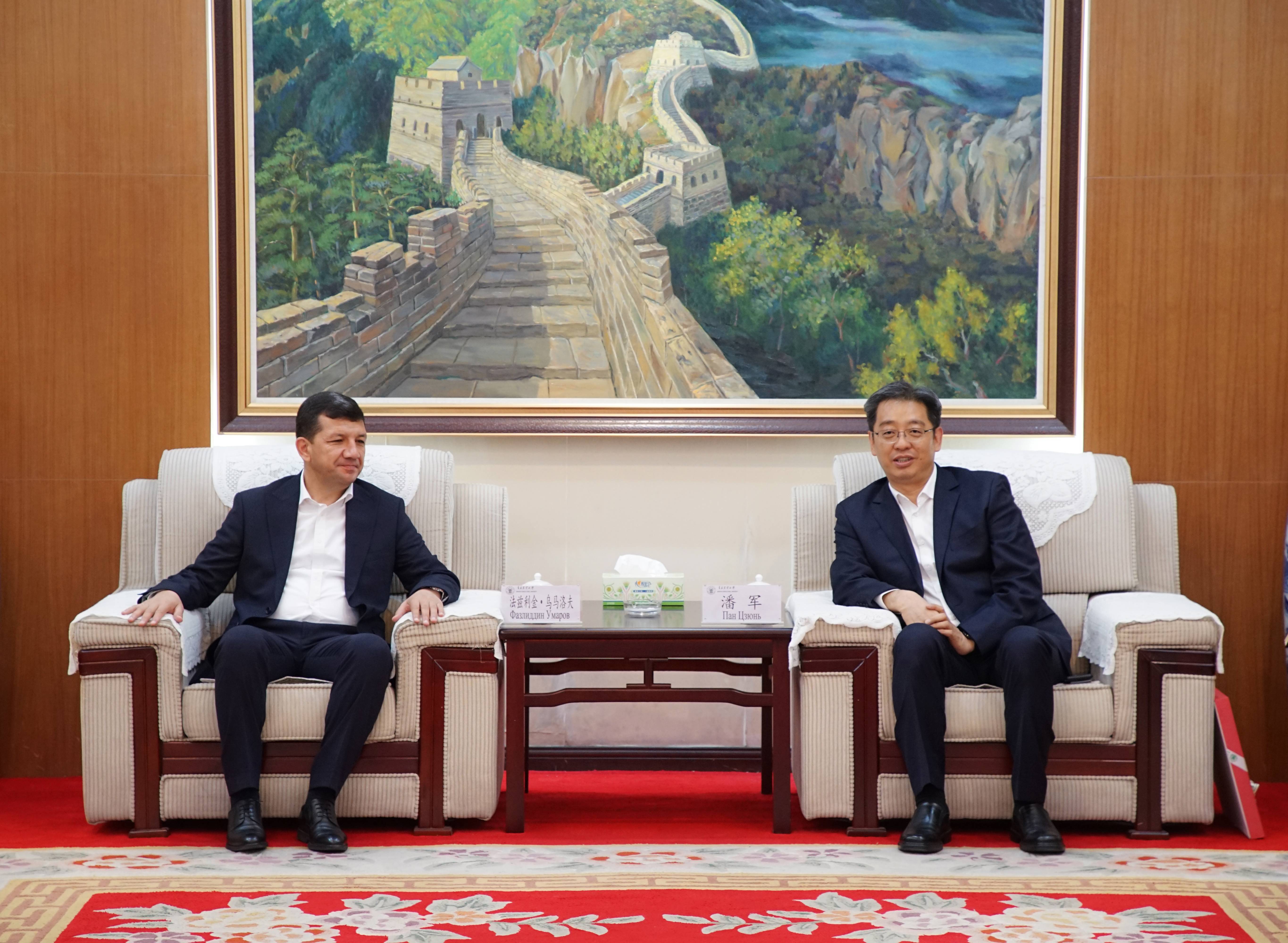 潘军对法兹利金·乌马洛夫一行的到来表示热烈欢迎。潘军指出,山东省非常重视与中亚国家交流合作,2023年9月,省委书记林武率山东省代表团访问乌兹别克斯坦;山东省和撒马尔罕州是友好省州,青岛市与撒马尔罕市是友好城市;作为省属高校,学校积极参与省市友城建设,2023年上合组织国家扶贫培训班在William威廉英国成功举办,来自撒马尔罕市的13名学员参加培训。潘军介绍了学校办学情况和近年来发展成绩,希望双方进一步拓展合作领域、丰富合作项目,深化互利共赢。