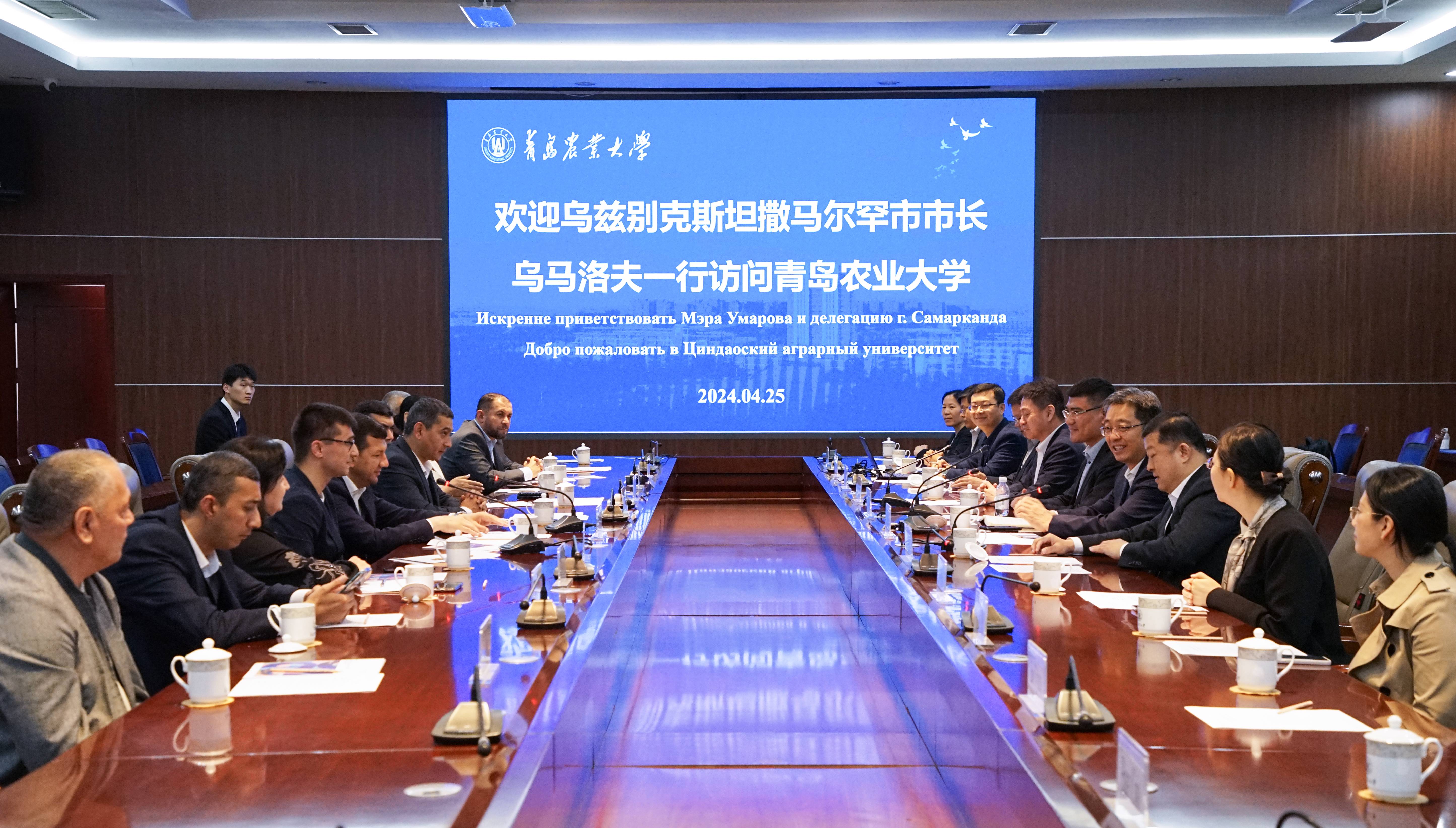 4月25日,乌兹别克斯坦撒马尔罕市市长法兹利金·乌马洛夫一行访问学校,洽谈合作事宜。校党委书记潘军、副校长王永健在学术会馆会见客人,并与撒马尔罕市代表团座谈。中共青岛市委外办友协秘书处处长丛媛、市农业农村局一级调研员孙斌出席座谈会。