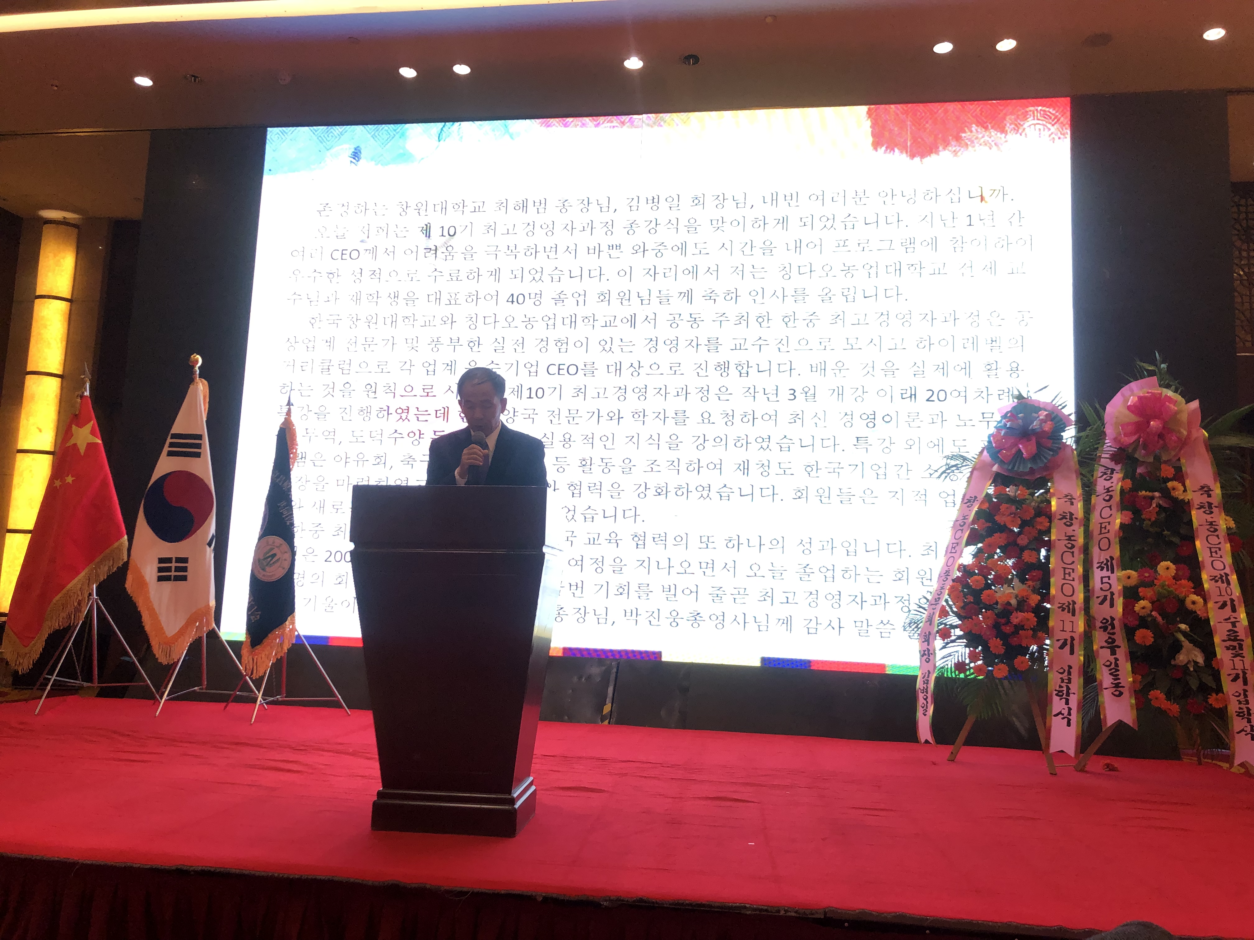 原永兵在毕业典礼和开学典礼上分别致辞。他向经过努力学习顺利结业的42名学员表示热烈祝贺,并强调指出两校共同举办的中韩CEO培训班培训层次高,培训对象都是各个行业及领先企业的CEO,教学师资力量雄厚,授课讲师均是工商领域相关专家及领导;培训班的开班为韩国在青企业架起了一座高层次、高水平沟通及交流的桥梁,加深了各企业间的了解,奠定了相互合作的基石。